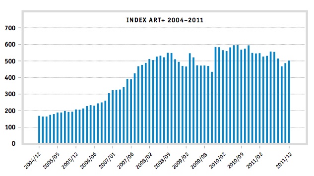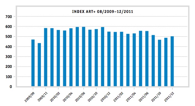 Index ART+ začínal rok 2011 na hodnotě 549 bodů a zakončil na 502 bodech. Meziročně tak poklesl přibližně o 8,5 procenta. Zatímco v předchozím roce víceméně stagnoval, loni pozvolna ztrácel.