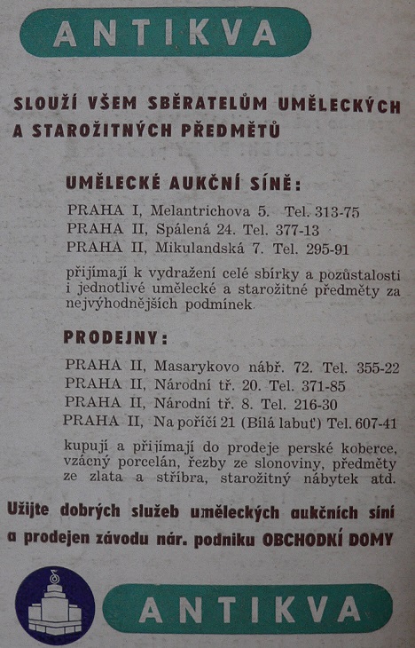 Dobovou kuriozitou ovšem zůstává, že tehdejší narychlo připravované aukční katalogy, nabízející tisíce položek v rychlém sledu, kromě řady jiných informací, vůbec neobsahovaly rozměry nabízených děl. Proč taky? Předpokládalo se, že se zájemce přijde osobně podívat. Na odbornější zpracování položek nezbýval čas. A také, čím méně zachovaných informací a stop, tím lépe. Velká část nabízených předmětů v této době se totiž do aukcí dostávala nelegální cestou z probíhajících majetkových konfiskací. Často šlo o celé soubory rozkradených předmětů ze znárodněných zámků, které pověřenci Národní kulturní komise nestačili zabezpečit.