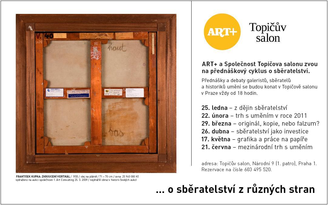 ART+ ve spolupráci se Společností Topičova salonu připravily přednáškový cyklus "o sběratelství z různých stran". Přednášky a debaty galeristů, sběratelů a historiků umění se budou konat v Topičově salonu v Praze, jednou do měsíce vždy od 18 hodin.