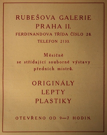Po desetileté disponentské praxi v Topičově salonu, těsně před vypuknutím první světové války, otevřel roku 1913 svou galerii na Národní třídě Karel Jan Rubeš. Na pravidelných měsíčních výstavách poskytoval prostor pro díla druhé poloviny 19. století spolu se soudobou tradičněji orientovanou tvorbou začínajících i zavedených autorů. Výjimkou nebyly ani prezentace umělců ze zahraničí.