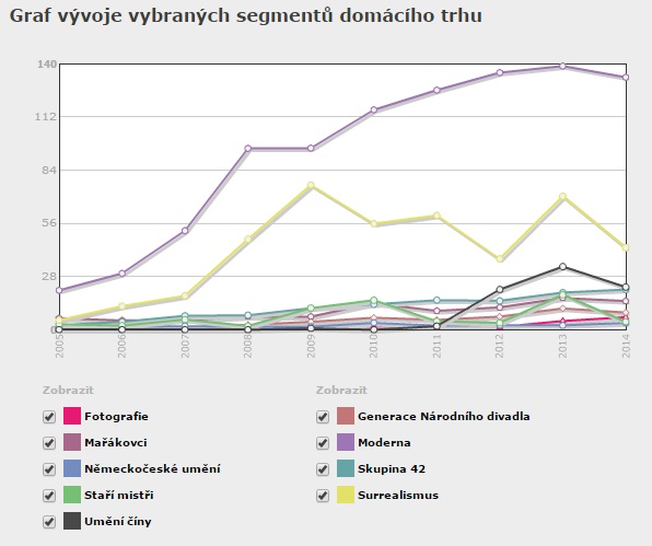 V roce 2014 se o 10 procent snížily nejen celkové tržby, ale i finanční objem na trhu nabízených děl. Zatímco v roce 2013 byla na aukcích nabízena díla dohromady za 886 milionů, loni to bylo 797 milionů korun (součet vyvolávacích cen v databázi ART+ bez aukční provize). Tento pokles nabídky lze dobře ilustrovat i změnou v počtech milionových položek. Zatímco předloni aukcemi prošlo 152 uměleckých děl s vyvolávací cenou nad milion korun, loni jich bylo o čtyři desítky méně. Ostatní parametry trhu – úspěšnost prodejů, hodnota nárůstů i neprodaných položek – zůstaly proporčně na stejné úrovni jako v roce 2013.