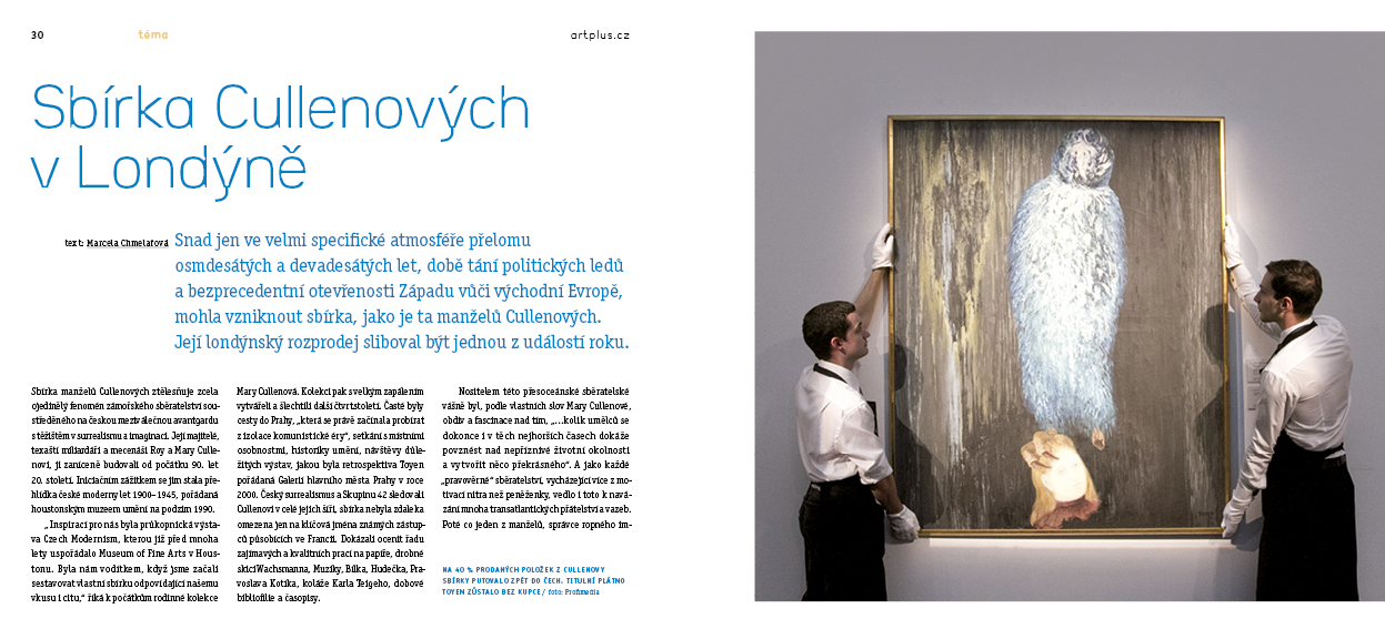 Větší tématické zastavení věnuje letošní ročenka okolnostem vzniku zámořské výtvarné kolekce české avantgardy manželů Cullenových z Texasu i okolnostem dražby této sbírky proběhlé v listopadu 2014 v Londýně. „S vědomím velkolepého úspěchu a ohlasu, jaký u zdejšího publika, nasyceného již možnostmi domácího trhu a bažícího po umění s puncem zahraniční provenience, sklidila licitace položek ze sbírky manželů Hascoeových v červnu 2011, šli navrhovatelé od počátku do dražby snad až s nepřiměřenými očekáváními. A to i cenovými, nereflektujícími příliš současnou situaci českého trhu, ani zvyšující se zkušenostní odstup zdejších kupců,“ ohlíží se za touto událostí Marcela Chmelařová.