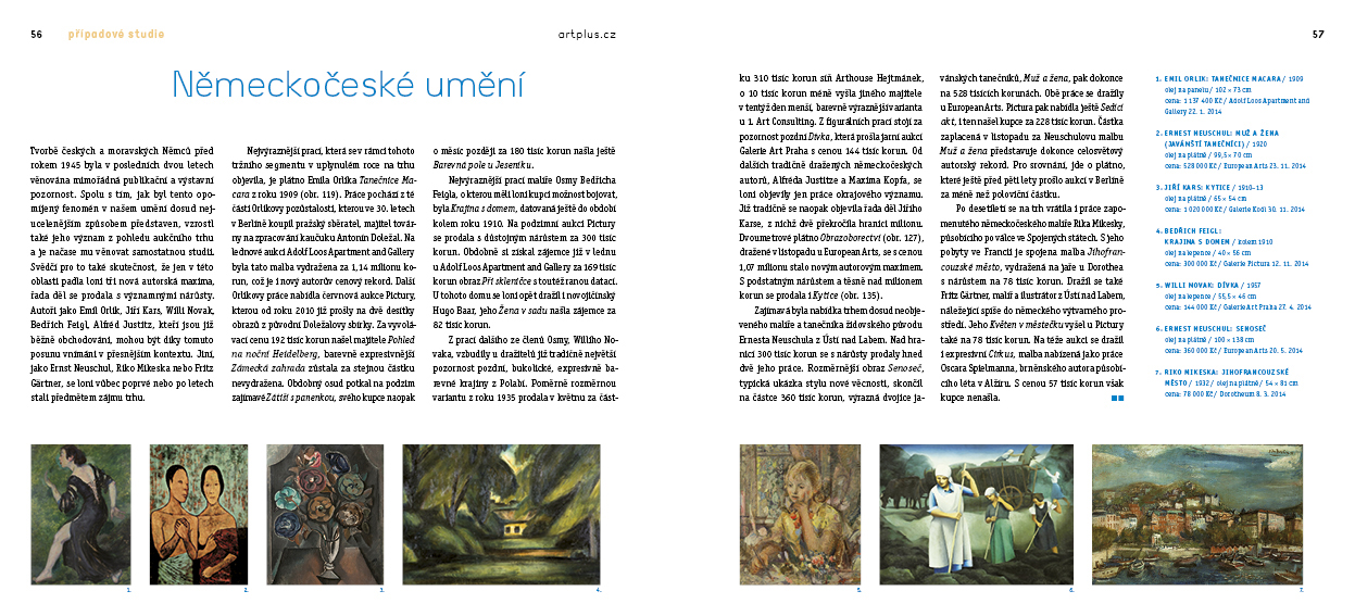 Kromě analýz v tradičních tržních segmentech věnuje letos Ročenka poprvé prostor dění v nově se utvářející oblasti německočeského umění. V souvislosti s nedávnými výstavními a publikačními aktivitami, sledujícími tento zajímavý historický fenomén českého umění, považujeme za potřebné se nad ním pozastavit i z hlediska trhu. „Je velmi zajímavé sledovat, jak nabídka trhu i kupující pomalu reagují na jména a díla, postavená i díky proběhlým Mladým lvům do nových souvislostí. Práce, kterých by si v katalozích ještě před pár lety sotva kdo všiml, najednou nabývají na zajímavosti,“ uvádí šéfredaktorka portálu ART+ Marcela Chmelařová.