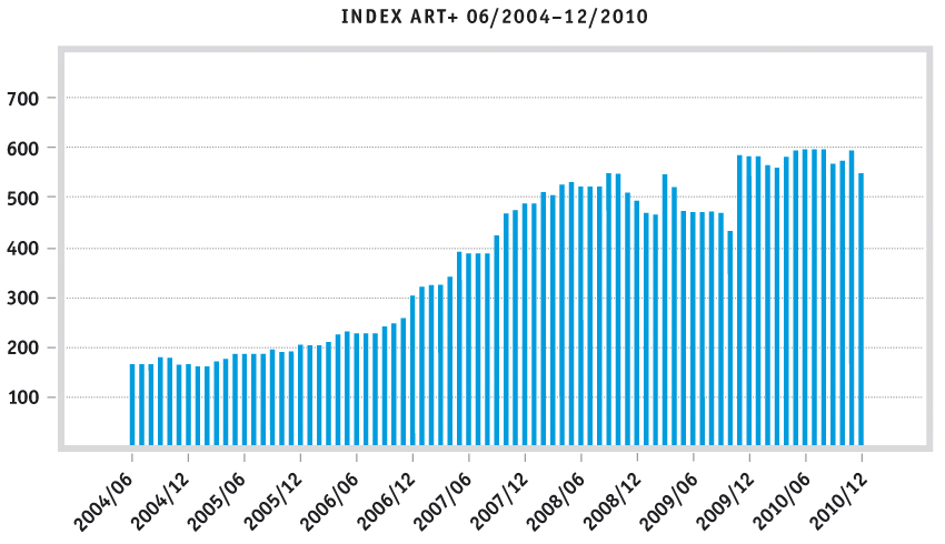 Index ART+ je počítán vždy ke konci měsíce na základě výsledků sledovaných aukčních siní. Zpětně je dopočítán až do ledna 2003. Index potvrdil starší statistiky a analýzy, které uváděly, že po několika letech stagnace začal trh s uměním v roce 2006 poměrně dramaticky růst. Od ledna 2003 do prosince 2005 index povyrostl ze 104 na 204 bodů. Na získání dalších sto bodů mu stačil jen jeden rok a v roce 2007 činil meziroční přírůstek dokonce 182 bodů. Do září 2008 pak trh povyrostl ještě o dalších 64 bodů na hodnotu 548 bodů.